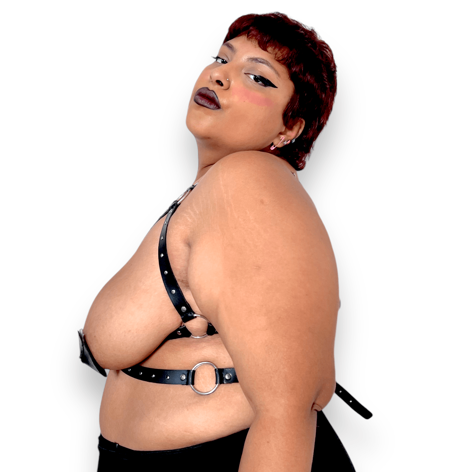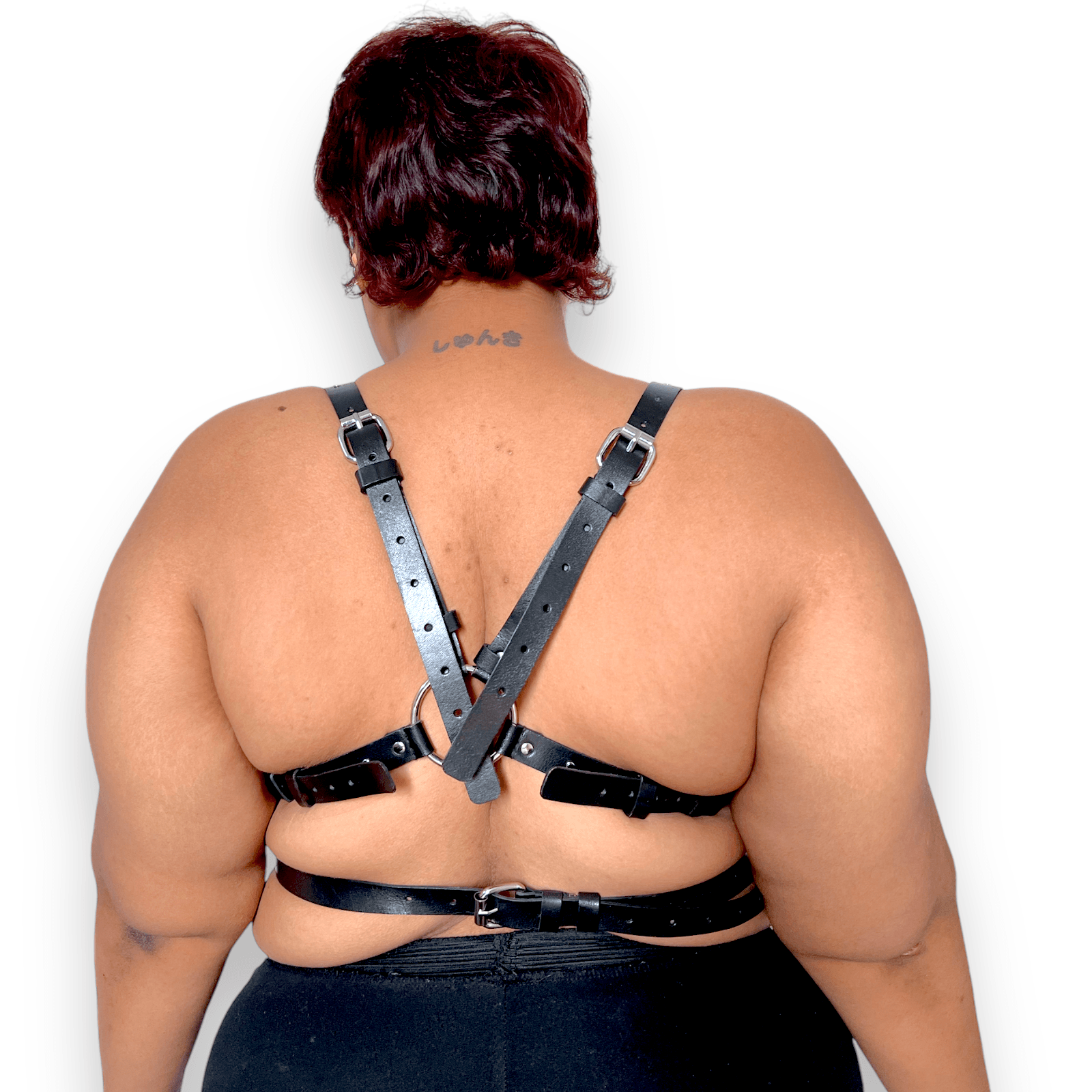 Selina Harness is a classic women harness handcrafted with genuine and smooth leather featuring 2 inches ring under the bust at centre, connecting rings on both shoulder sides that further carries and connects to a 2 inch centre back ring with the help of fastener buckles on each side. Sides feature two rings on each side for adjustment and further connection to the centre back ring with the help of buckle fasteners. Selina Body harness also features stud riveting across the harness for visual aesthetic.